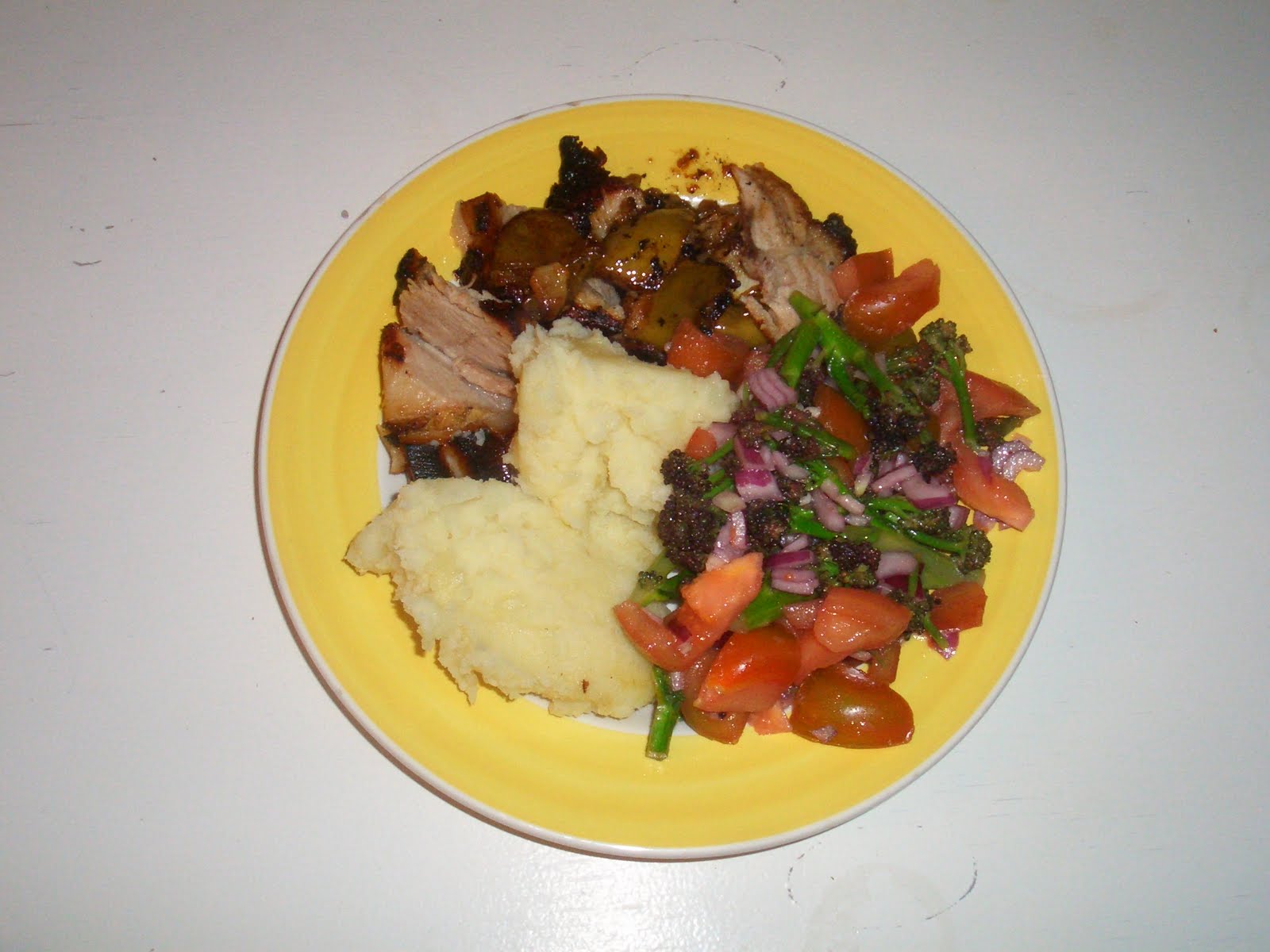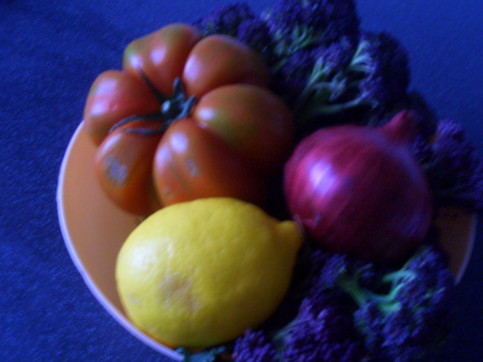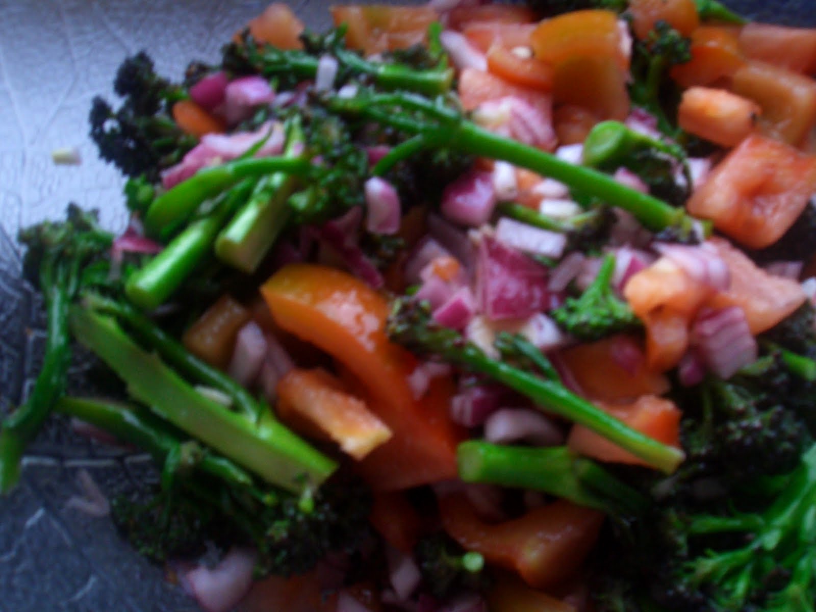 Let the broccoli cool, then add the chopped red onion and tomatoes, grate the garlic on top and pour over the juice of one lemon, some olive oil and a little bit more sea salt. It turned out really great, though I think next time I may also add capers to the mix, as I think they’d work well, and I’ll try it with lamb too, as originally suggested
