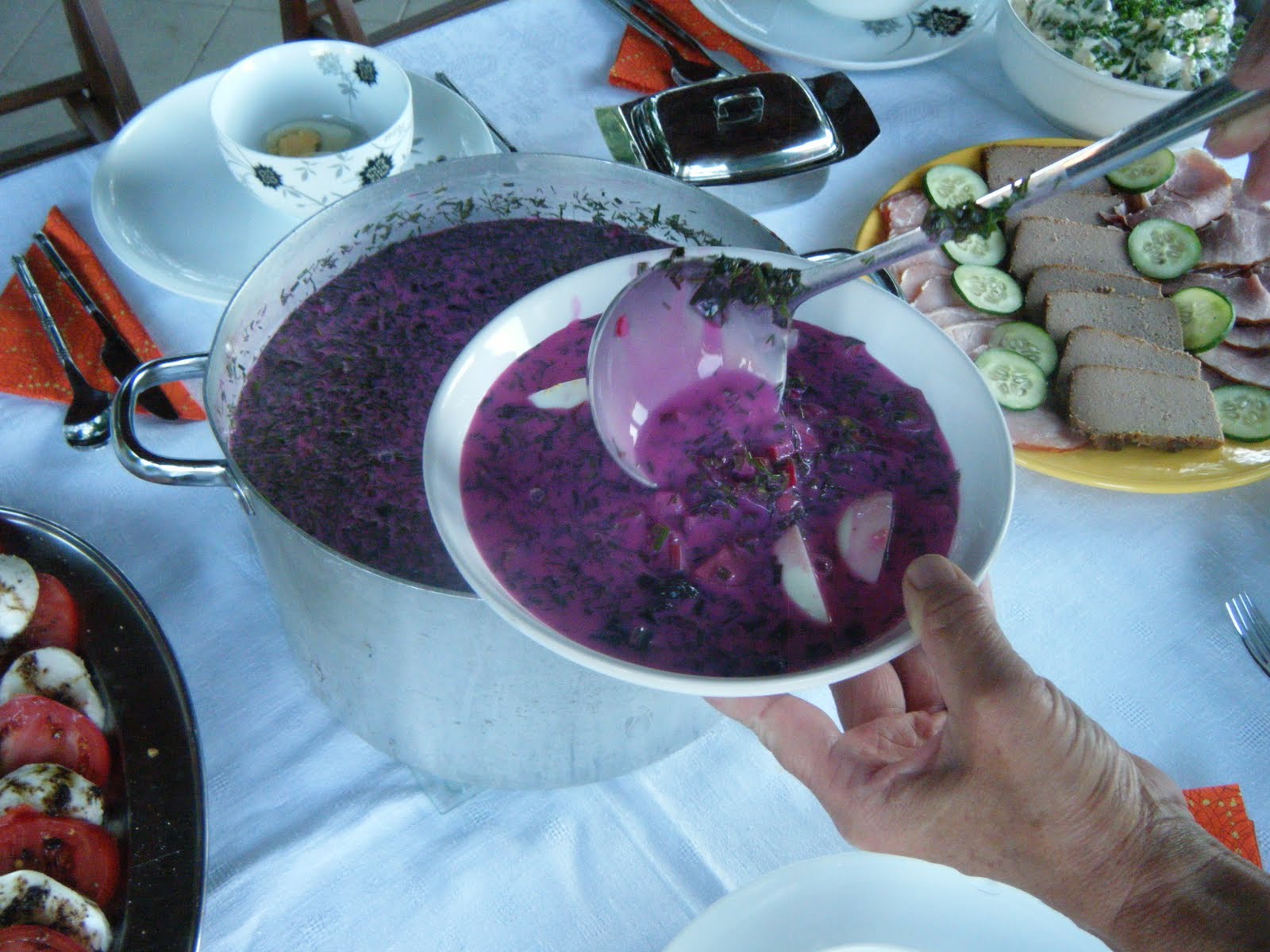 You make a vegetable stock out of the carrot, parsnip, leek, celeriac, and chopped beets. After about half an hour of cooking time you remove everything from the boiling water, and throw it all away except the beetroot (you can use the cooked veg in a russian salad if you don’t want to waste them). Now, you add the finely chopped stalks and leaves and cook for a further 20 min. Once cooked, you let the soup cool – it could take up to two hours. Finally, you add all the other ingredients which have been finely chopped beforehand, as well as the sour cream and yoghurt, which have been blended together. Put this mixture in the fridge for another hour or so before serving. This soup is incredibly refreshing and even though this was the first time I had made it on my own, everyone who stopped by the house and had a bowlful, praised it wholeheartedly. I don’t think this is because my chlodnik was better than anyone else’s, it’s just a soup that you can’t fail to appreciate in the 40 degree heat