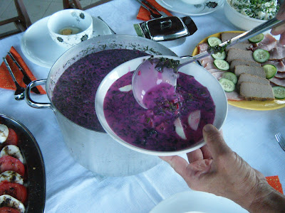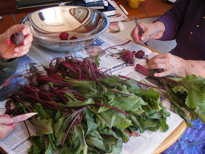 That’s my two lovely grandmas preparing the beetroot. You need to use young beetroot for this, therefore it’s a very seasonal soup. We use both the beetroot themselves, peeled before boiling, as well as the leaves and stalks. If you can’t get the stalks, however, then, my grandma assured me, you can leave them out of the recipe without causing too much damage. I’m afraid that I can’t give you the exact quantities we used. The amount of beets we used, up there, and the other vegetables, below, made about fifty servings, at a guess. I’d say just use any quantities you want and experiment, until you get the texture and flavour you are happy with