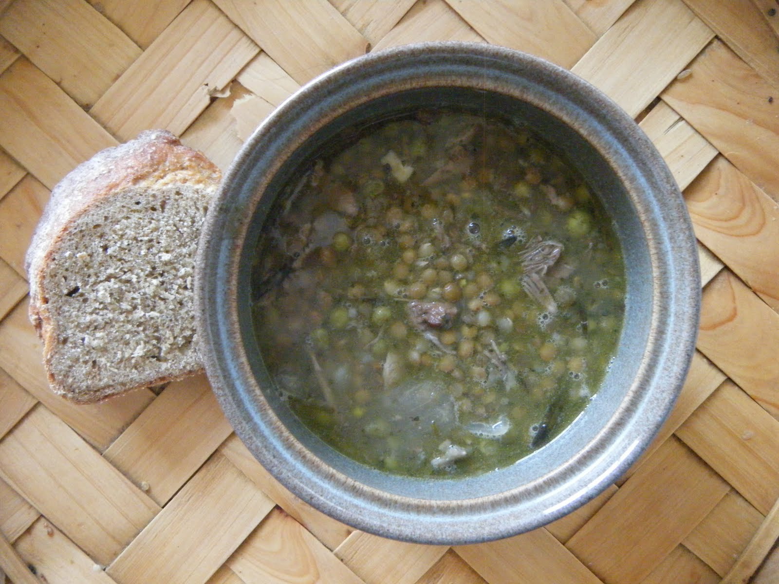 I covered the carcass, leftover potatoes, rosemary, onions, peas and mint sauce with cold water and brought it to the boil. I let this simmer for a couple of hours and then left to cool. While it was simmering, I soaked some green lentils. When it was back to room temperature, I took the carcass out and pulled all the meaty bits off, putting them back in the pan, and discarding the bones. I added the lentils and cooked the soup once again, until they softened, seasoned it, and ate it for supper with some fresh crusty bread