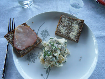 The herrings my mum bought were very salty, so we soaked them for 20 min in cold water, before chopping them into bite size chunks. The eggs and pineapple were chopped into the same sized bits and added to the bowl. We mixed the sour cream and sugar together and added a couple of tablespoons of mayo. Then poured the sauce onto the salad and mixed well, adding pepper to taste. Once the salad was transfered to a serving dish, we sprinkled it with finely chopped chives and chilled for 20 min before serving. Great with ice-cold vodka!