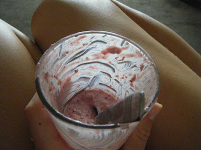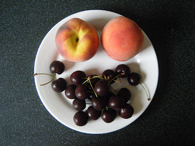 In my previous post, I made a raspberry and almond pot, whereas today, it was peach and cherry. I poured boiling water over the peaches, in order to peel them easily, and blended them along with the cherries, greek yoghurt and honey