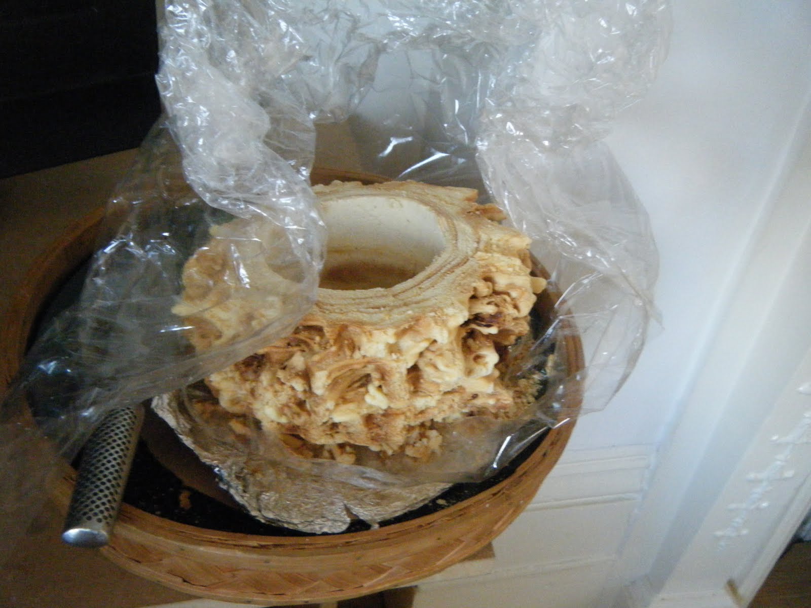 And this is how I have been drinking copious amounts of green tea – with cake. Those two woody looking slices up there are a Polish speciality from near the Russian border. It’s called “Sekacz”, and this is what it looks like as a whole