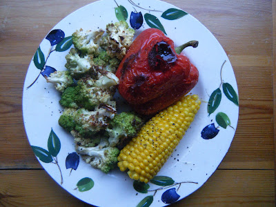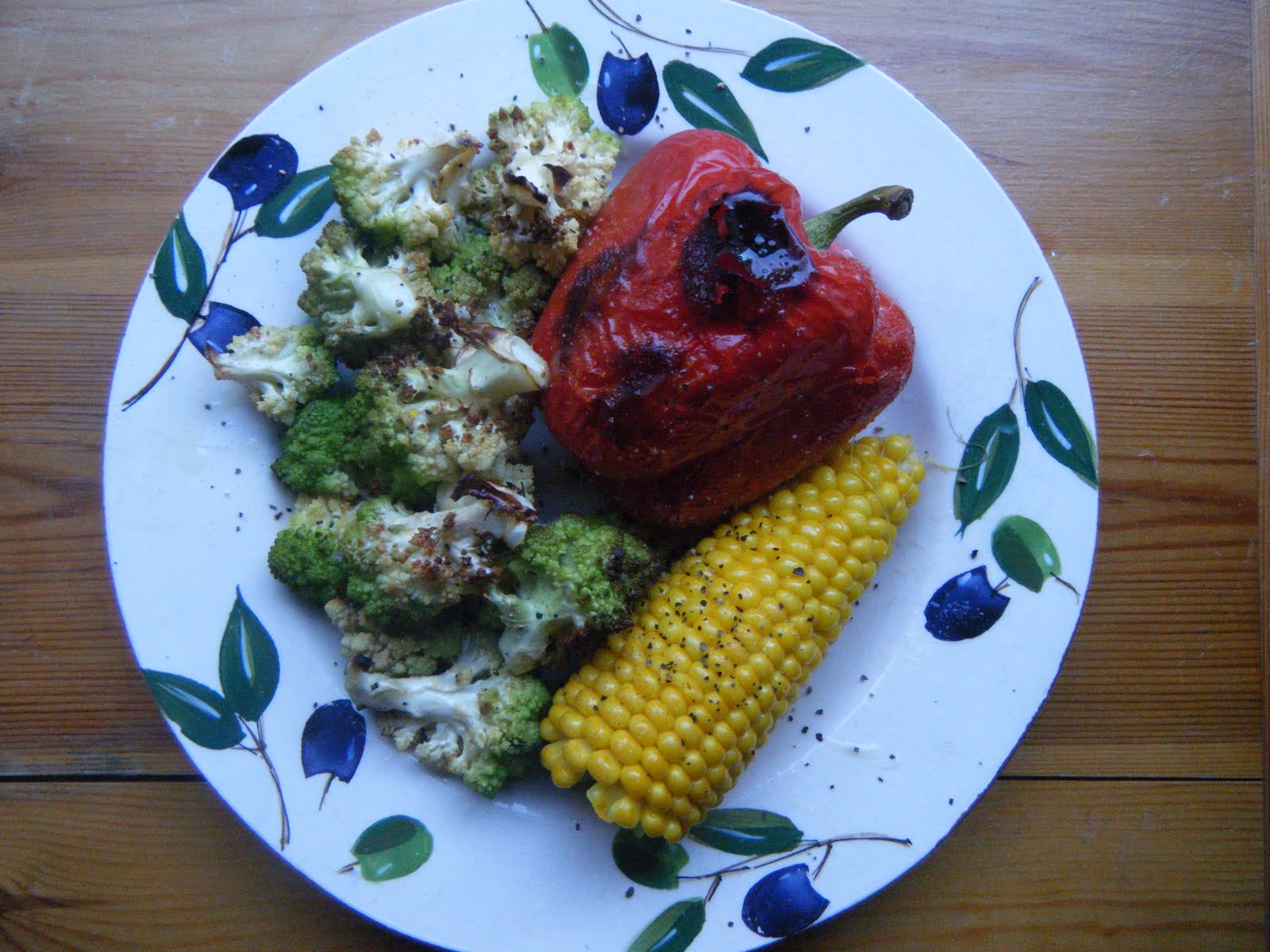 I ate it roasted, with a red bell pepper, simply with olive oil, salt and black pepper, then dipped in spicy lime pickle. The corn on the cob was boiled and smothered in butter. I’d like to say that was my dinner, but it wasn’t. I was having dinner late, so I decided that I would eat lots of vegetables then have a very light dinner later on (I didn’t – I went to Portobello Ristorante Pizzeria and stuffed my face with delicious bread and spaghetti vongole)