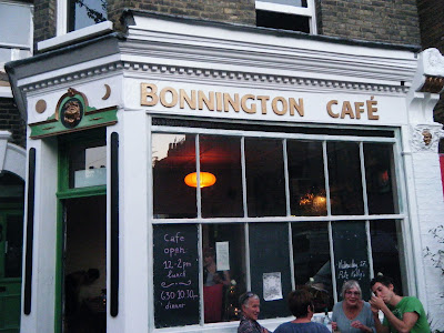 I would order the pigeon again, but not the Japanese radish (?) sorbet you can see up here with what looks like snail slime around it. The main point here is that with some places, it’s worth taking a risk. Another one of these places is the Bonnigton Cafe in Vauxhall. It used to be a squat and now it’s a lucrative community project. Every night is a different cook, but you can always get two courses for a tenner, and bring your own wine. You also have to book a table way in advance by emailing the chef on duty that night