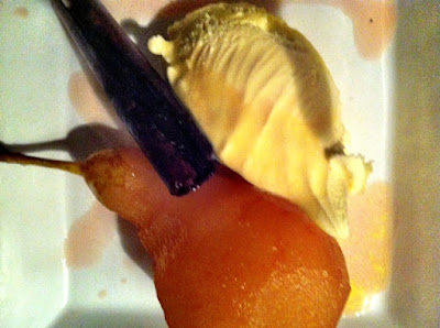 And here are the pears which I simmered in a mixture of ginger wine and cherry vodka (Wisniowka), with a couple of cinnamon sticks, for about an hour. I covered the pan and clearly left the gas on too high because before I knew it the whole thing was on fire in the most spectacular way. I wish I had thought to take a photo but we were all panicking slightly to tell you the truth, and then Tommy blew it out, thank god. I’m glad he didn’t set himself on fire, as when my dad did that once he singed his eyebrows, and Tommy has a lot of hair
