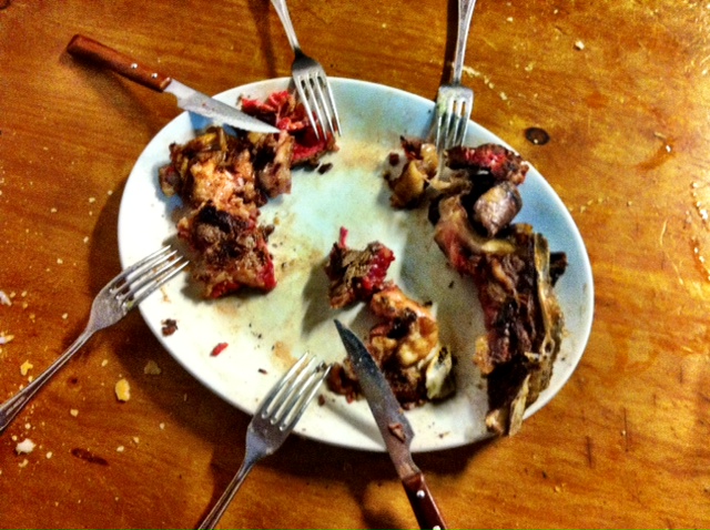 Because it is so young, the cider needs to be poured from far away to get the bubbles in it, and you only have a little amount in your glass at one time. When anyone at your table finishes drinking, they shout “Txotx” (pronounced “choch”, not to be confused with “chochi” as our friend did, which is a rude word). Throughout the night you get brought plates of food. In every cider house, it’s different stuff depending on what they have. There are no chairs, just tables, and there is no choice. We started with a melt-in-your-mouth cod omelet, then had two different types of cod (one with sauce, one with peppers), because we couldn’t decide which we preferred so the waiter said he’d bring us both, succulent steak, followed by cheese with membrillo (quince paste) with walnuts. Everything fresh, locally grown and reared. All the kind of food that I love. This is clearly rustic, country food, yet I think that there’s an elegance to eating like this, one that comes from simplicity and confidence