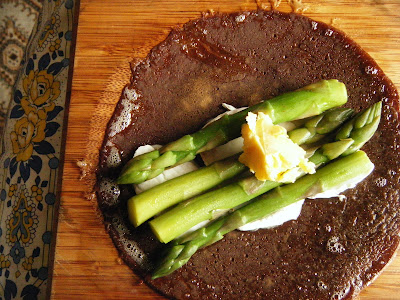It’s British asparagus season so it annoys me to see asparagus flown in from Peru still on the shelf at Tesco’s. Why why why. Anyway, if you want to read my opinions on these matters, then read this (there’s a few extra exclamation marks than I would like to see, but apart from that it’s mine), otherwise let’s talk about lunch instead. I made corn tortillas, but in my own way. I did a bit of internet research, but there was talk of griddle pans and special types of cornmeal, so I just ignored it all and went with my instincts and my intuition. This is what this year is about for me after all – that was one of my personal resolutions and one which recently I’ve had to remind myself of. It’s only too easy to get lost in a world of other peoples’ expectations, but I’ve done too much soul searching to go down that route now. And besides, I had a special type of toasted cornmeal from Lanzarote that I wanted to use – that’s why the tortillas are brown in case you’re wondering, I hadn’t burnt them. After some experimenting, what I came up with was a cross between pancakes and socca, but since they are made from cornmeal, I’ve called them tortillas