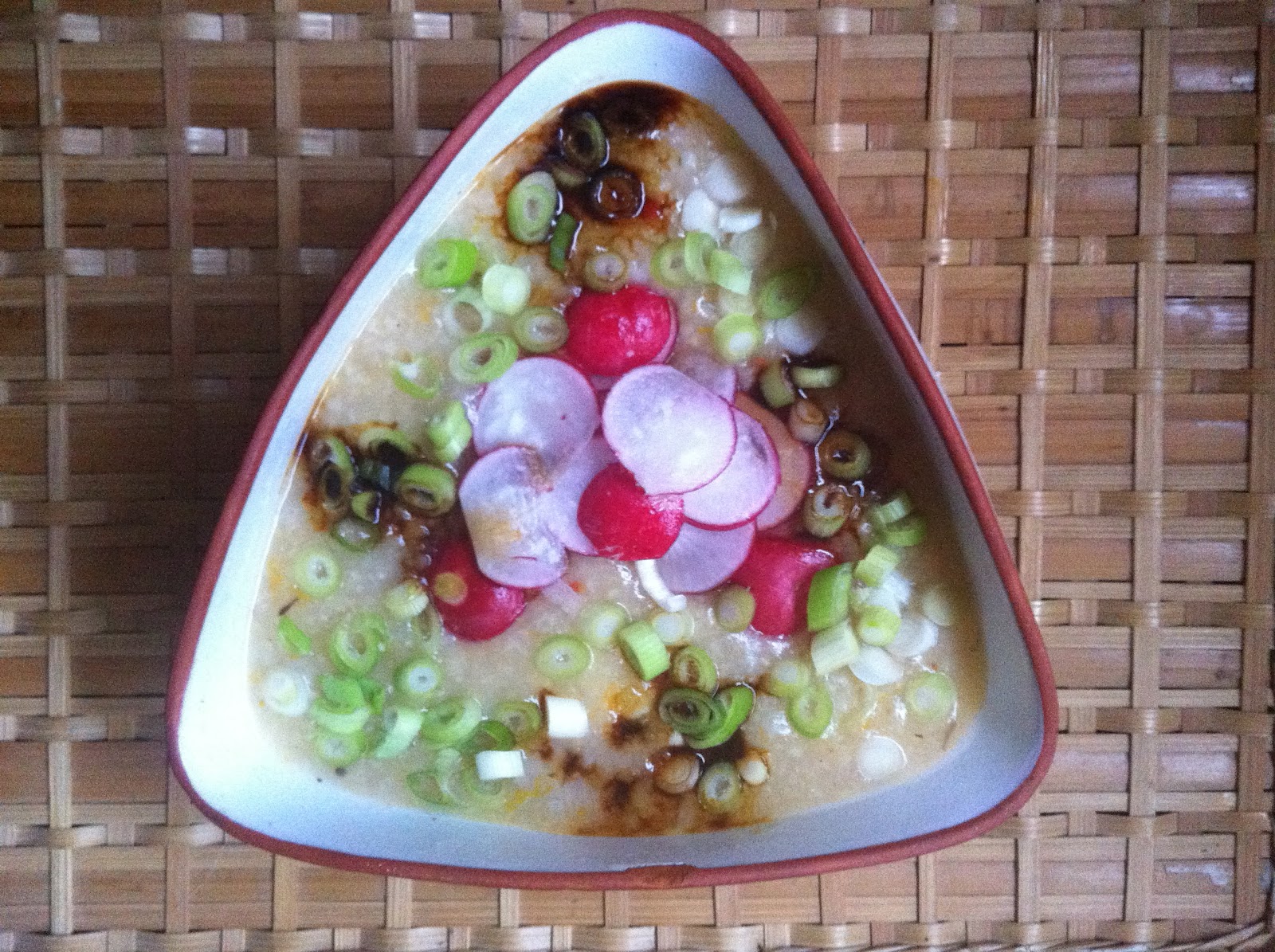 I’m getting into this whole congee thing. Just as there are infinite varieties of porridge, it’s the same with congee. This is a vegetarian one I made, by cooking white jasmine rice and butternut squash for about 3 hours in loads of water. I also added some chilli, sea salt, garlic and paprika. When it was ready I added crunchy bits of spring onion and radish, then soya sauce for flavour