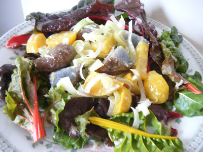In preparation for this salad, you need to cook and cool both the potatoes and the beetroot. The beets we peel, the Shetland blacks we leave in their stylish little coats. For the dressing, we grate the horseradish root and mix in a jar with the lemon juice, mayo, olive oil, garlic salt and pepper. I used just an inch of horseradish, which made it pretty mild. Mix the potatoes, beets and leek with the dressing, and place on top of the chard. Eat with slices of cheese on the side, a glass of white wine and pleasant company