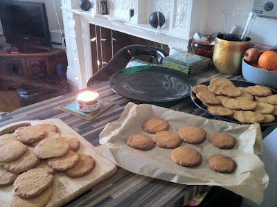 Heat the oven to 180 degrees C. Melt the butter on a low heat, add the sugar and honey and heat gently until the sugar dissolves. Grate the nutmeg into this and heat for a couple of minutes longer, then take off the heat, and allow to cool slightly. Sieve the flour, baking soda and ground ginger into a bowl and mix together. Now, add this to the pan and blend until you get a soft, warm dough. Now is the fun bit – enjoy. When the dough appears smooth take little bits of it and form into balls, placing each one onto a tray with greased baking paper on it. Flatten each one down and leave plenty of space between them. I fit 7-8 on one tray. Bake in the middle of the oven for 10min. Allow to stand for a few minutes before placing on a rack or plate to cool properly. We ate these washed down with warm, spicy mulled wine