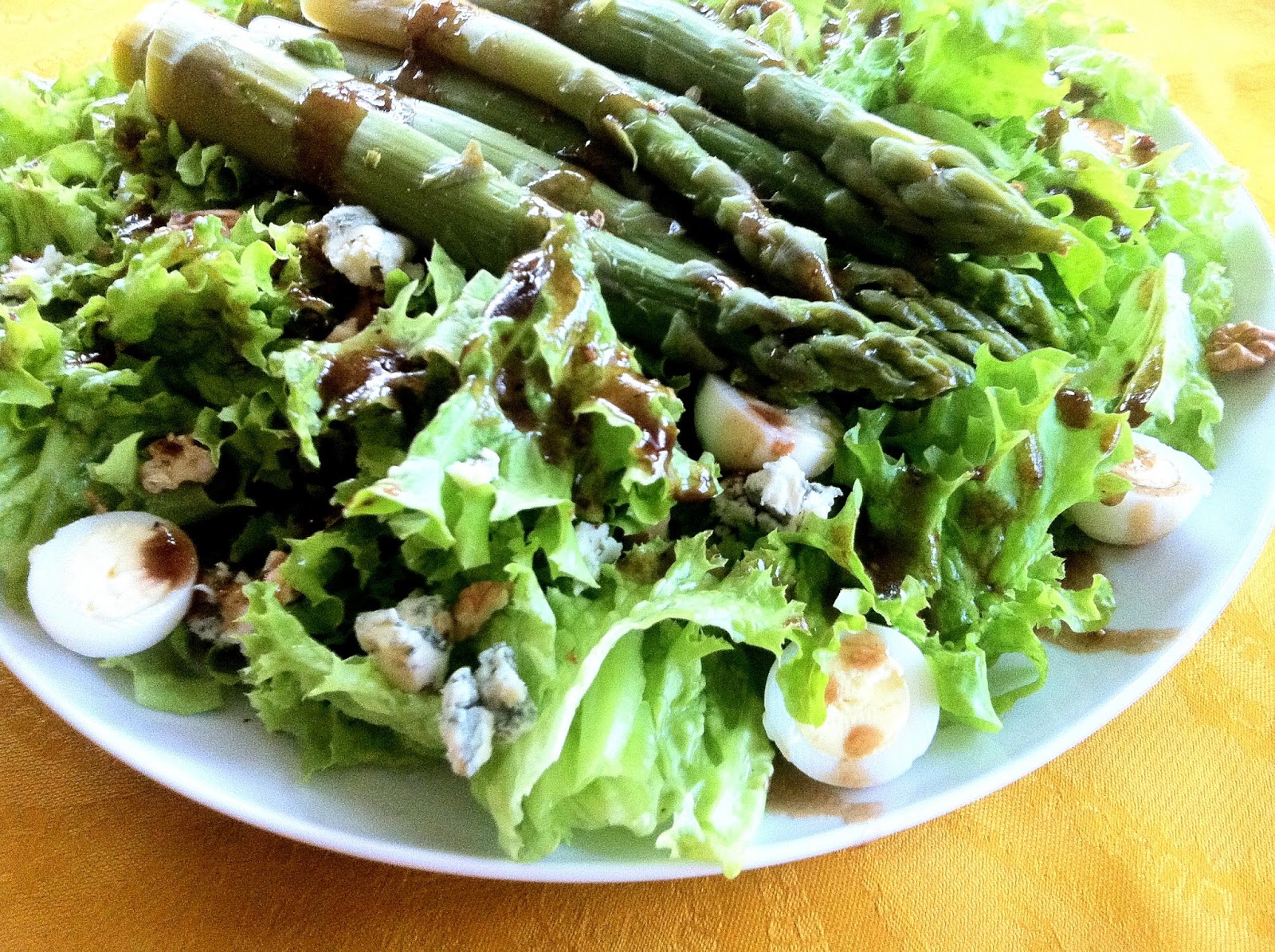 And for the second one, cook the fresh asparagus for about 5min in boiling water, so that they are still firm and a little bit crunchy. If they are the fat ones like those up there, you should either cut a couple of inches of the end off, or peel the ends. The bed is a curly, crunchy type of lettuce, blue cheese, walnuts and hard-boiled quails eggs, and the vinaigrette is a sweet one with a mxture of olive oil, balsamic vinegar, honey, salt and freshly ground black pepper. With both the vinaigrettes the ratio of oil to vinegar is 3-1, and I use a jar to shake all the ingredients together