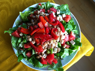 For this one, you need to prep by: firstly, frying an onion in some olive oil for about 7-8min, adding the beans, salt,pepper and cinnamon and frying until warm; and secondly, grilling the red pepper with olive oil, salt and chilli flakes for about 6-7min. The salad bed is torn lettuce and basil leaves, chopped tomatoes (we call these rasberry tomatoes here in Poland, not sure what they’re called in the UK, but the have a rasberry-coloured hue), and chopped feta. On top, we have a light vinaigrette of olive oil, apple vinegar and lemon juice mixed together, buckwheat honey (this is a dark, strong-tasting variety), salt and white pepper