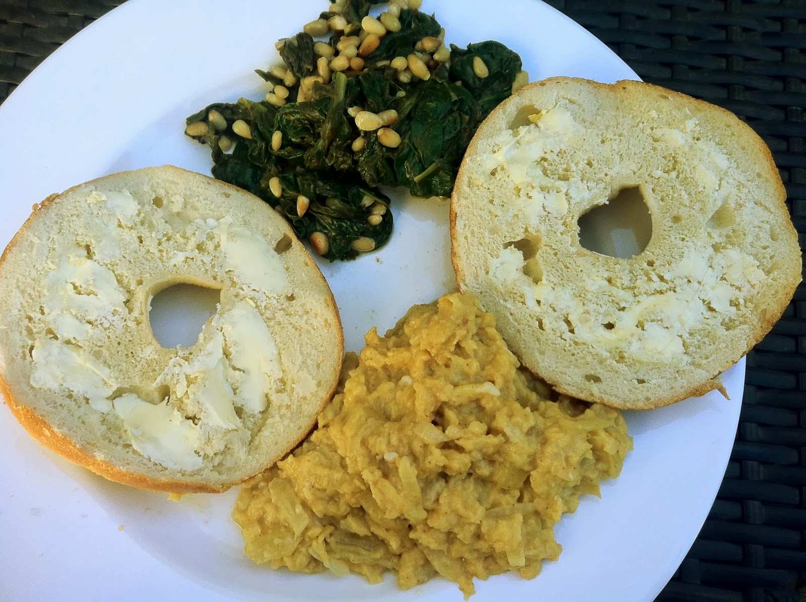 I lie about it being perfect, as there was one thing missing – a Bloody Mary. But with that addition, I couldn’t think of a much better one. If I had the kind of lifestyle when I could eat brunch every day of the week (I can dream), then I would alternate this with Eggs Benedict. So it’s pretty good. The eggs are my mum’s Polish recipe: fry a finely chopped onion in butter, covered, for about 10min, then add the eggs which have been beaten and seasoned with sea salt and paprika. Cover the baby spinach in boiling, salt water and after a couple of minutes, drain it. Toast the pine nuts until slightly browned. Squeeze the water out of the spinach and add to the pine nuts along with some olive oil. Fry for about 5 minutes while stirring. Squeeze some fresh lemon into it and continue frying for another minute or two. Serve with fresh, warm bagels if possible