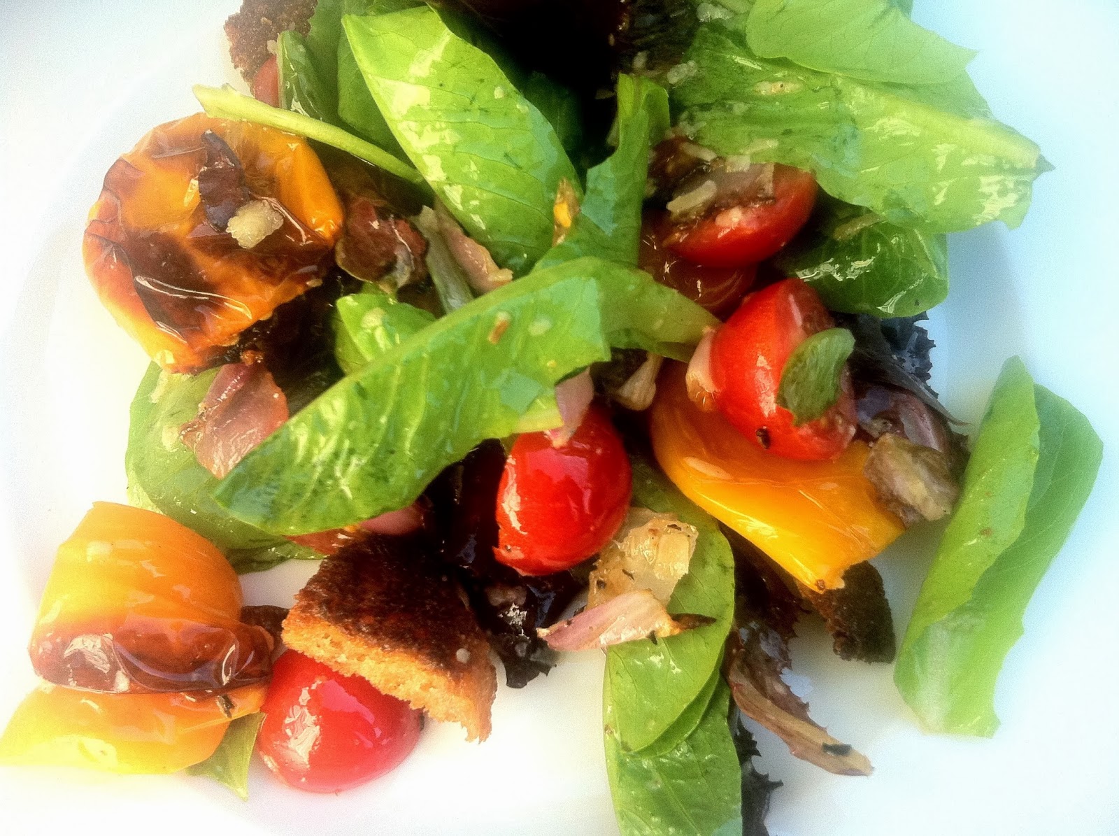 I have been traveling for ever now it seems like. Living out of a suitcase, waiting for delayed planes, lost luggage and suspected terrorists. Meeting friends in unlikely places, swimming in any bit of water I can find, whether it’s a sea, ocean or an unexpected lake. Eating pastas and pizzas in Italy, oysters washed down by plenty of wine in Napa and San Francisco. Some tacos and beer too. Quite a few burgers. The last time I properly cooked was in LA, when I made healthy stuff for Simone and myself every day. This was a particularly well-turned-out salad with some of those small red and yellow peppers (they should be called baby peppers but they’re not as far as I know), a large red onion I found lying around the fridge and some warm, crunchy home-made croutons. There is really nothing in the world like home-made croutons, I seriously must encourage to make them yourself