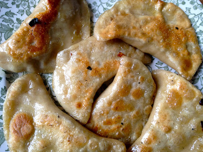 Sift the flour into a bowl and add the yolks, butter and salt. Blend with your fingertips, then stick together to make dough, adding the water, bit by bit. Kneed the dough for about 7-8min, before covering in a damp towel and leaving to rest for 20min. Make the filling by frying the onion in a large knob of butter until golden. Add the mushrooms and fry until the water has evaporated. Cook the sauerkraut by simmering in a pan of water for about 15min. Blend everything. Add some olive oil if you are finding it difficult to blend. Fry the mushy ingredients all together in some more butter, or olive oil if you don’t want to overdo it on the butter front. Allow to cool. Now roll out the pierogi dough on a floured surface, as thin as you can. Use a large cup to cut circles in the dough of about 9-10cm in diameter. Any less than 9cm and it gets a little hard to get a decent amount of filling in. Use a teaspoon to put in a dollop of filling into the middle of each circle. Flatten the edges before you attempt to stick them together. Press hard, be bold. Bring a pan of salted water to the boil and place about 6 pierogi in at a time. Cover. Once they float to the top (you’ll have to check every minute or so), give them another 5min, then remove. You can eat them like this, but I like to fry them in a mixture of butter and olive oil first, it makes them even tastier in my opinion