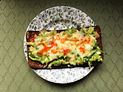 Take a piece of rye bread and toast it. Meanwhile, mash a soft avocado with some sea salt, half a red chilli and a bit of fresh, chopped coriander. I could have used my pestle and mortar for this, yet I used an ordinary fork and a chopping board. Squeeze a bit of lime in to make the mashing easier. Place the guacamole on top of the rye bread and put it on a baking tray. Grate some cheddar on top. Or another strong-tasting hard cheese. Grill until the cheese is melted and golden, then sprinkle with chilli sauce to finish. Yum!