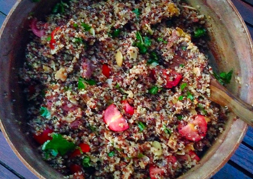 It’s a blend of 3 different types of quinoa – red, black and pearl. You can get a ready mix in (some) Waitrose, with home grown cherry tomatoes and chillies (luckily I have a man who grows these, because I still haven’t quite got my head round that part), toasted almond flakes, coriander and cinnamon sweet potato (roast the chunks of unpeeled sweet potato in the oven with olive oil, honey and cinnamon). The dressing consists of lime juice, mild olive oil and fish sauce. We ate it with southern fried chicken a bit like this one, but with more spices in the marinade. Yas says the trick is to add a little a bit of cornflour to the flour and breadcrumbs and the oil you fry them in should be hot but “not too hot”. Having made this chicken about 5 times in a row now, he’s the expert
